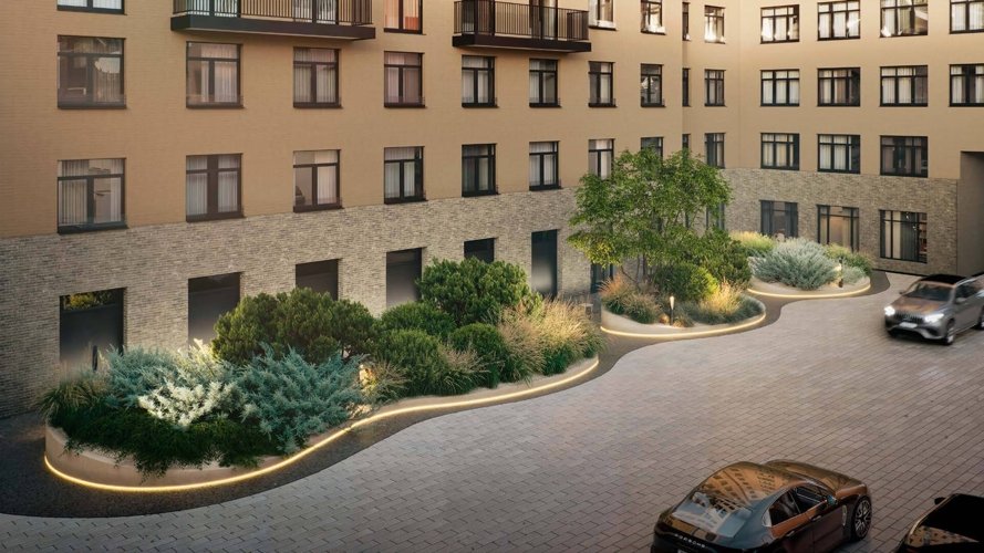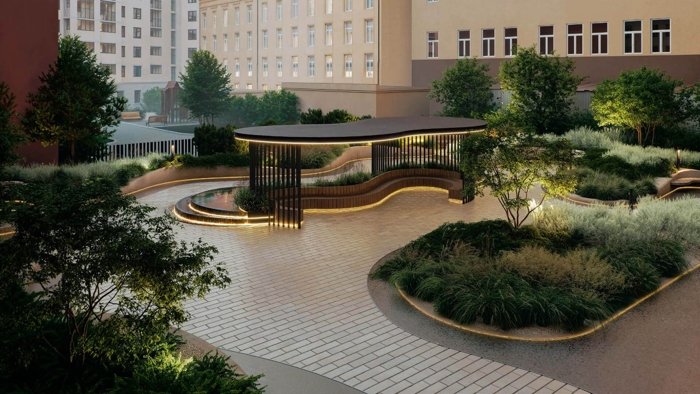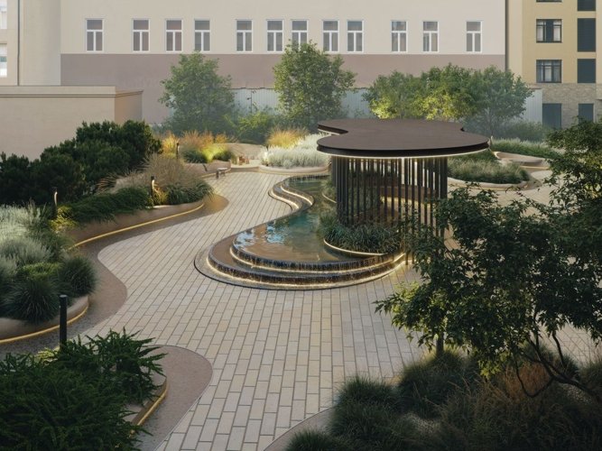 Безопасное пространство, где можно спокойно отпускать детей и отдыхать самому. Водная гладь, зелень, пергола и лаундж-зоны — двор становится местом притяжения, а не просто проходом.