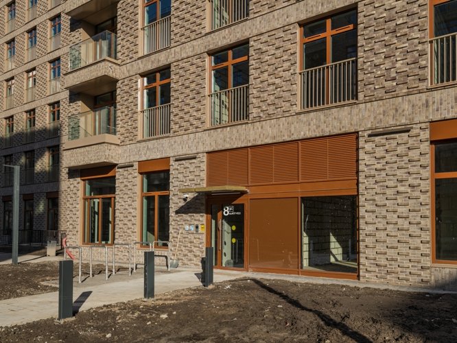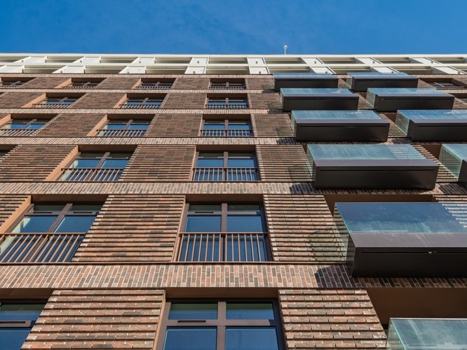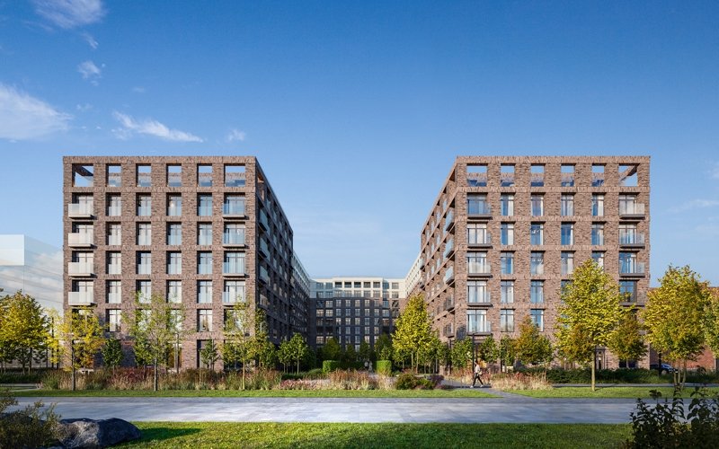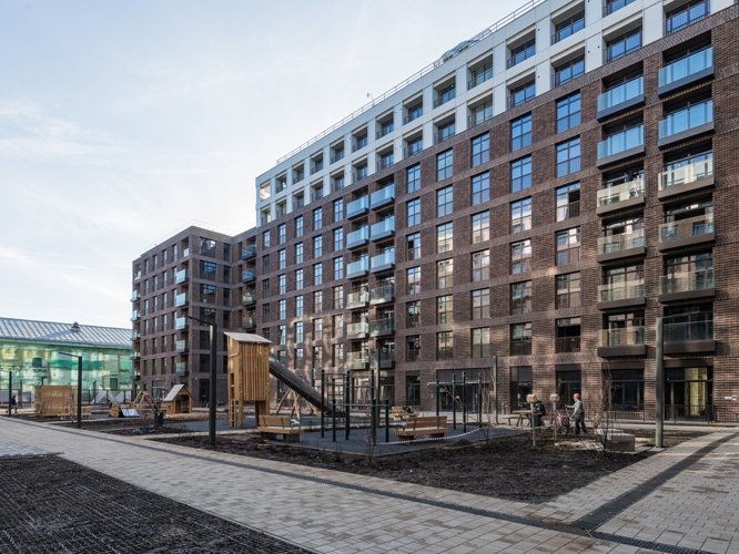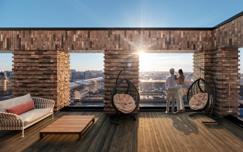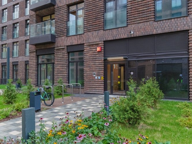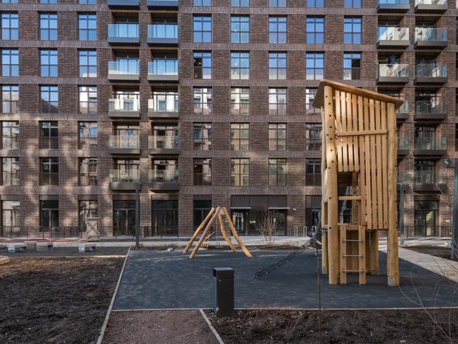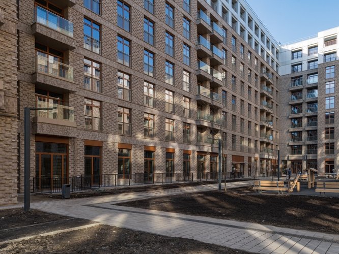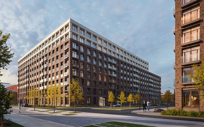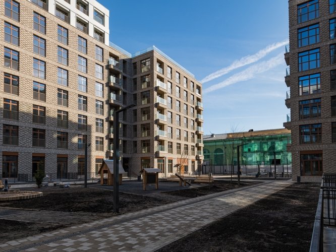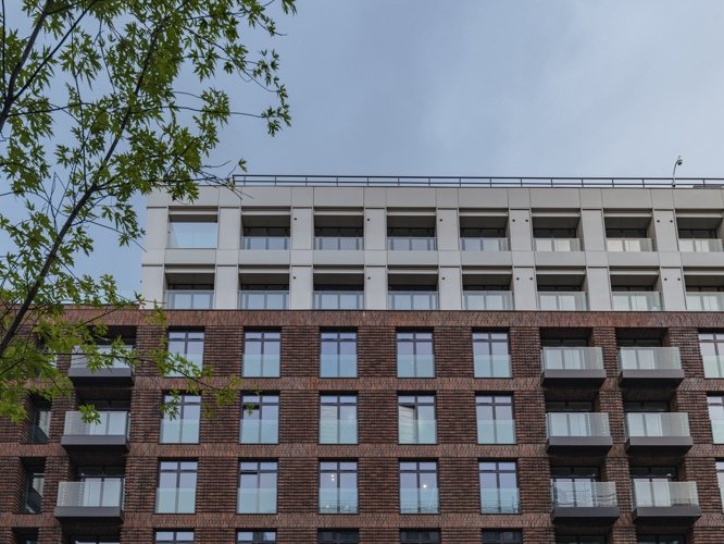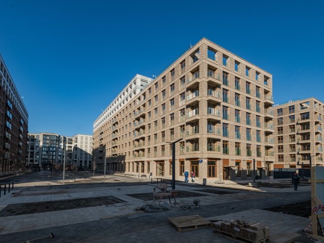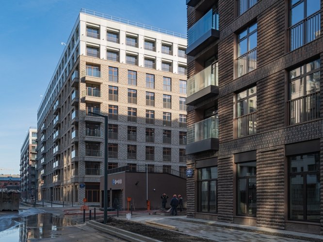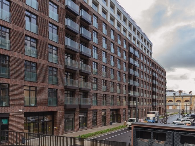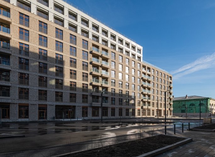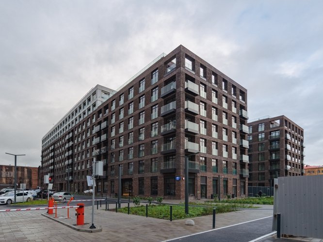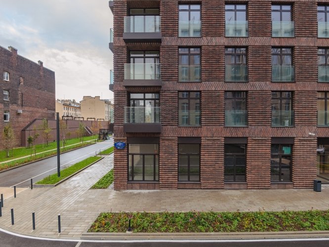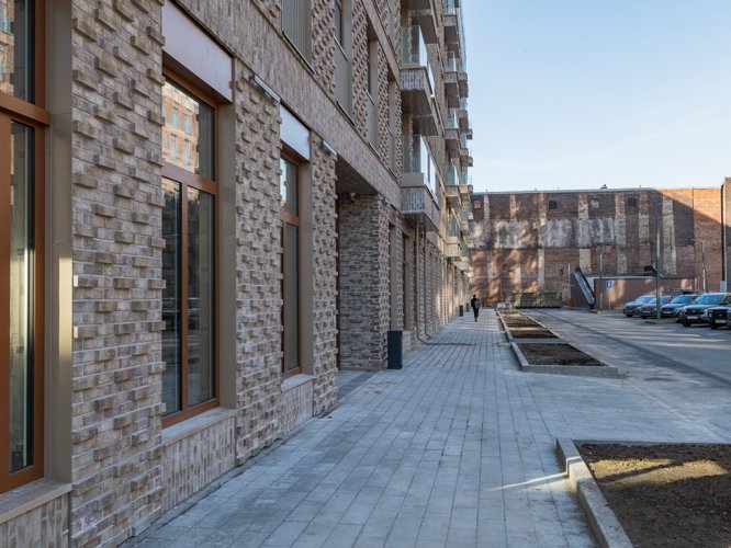 Фасады из клинкерного кирпича и рельефная кладка отсылают к индустриальной эстетике старого Петербурга, но выглядят современно и стильно. Дом органично вписан в окружение — без ощущения «чужеродности».